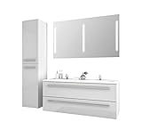 - HINWEIS: Der Lieferumfang umfasst einen Hochschrank, einen Unterschrank, einen Spiegelschrank und ein Waschbecken. Der Unterschrank und Spiegelschrank werden in demontiertem Zustand verschickt, d.h. eine Eigenmontage auf Grundlage einer Anleitung wird erforderlich.