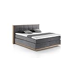 - Modernes Boxspringbett mit Verkleidung aus massiver Bio-Eiche (geölt), inklusive zwei Federkernmatratzen in den Härtegraden H2 + H3, durchgehendem Kaltschaum-Topper, OEKO-TEX 100 Stoffbezug und gepolstertem Kopfteil mit moderner Steppung