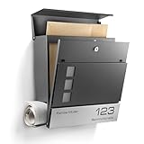- [Was Sie bekommen] Einen stilvollen Briefkasten mit Aufklebern gegen unerwünschte Werbung. Er besteht aus verzinktem Stahl mit Pulverbeschichtung und sowohl robust als auch rostbeständig und sorgt dank der anthraziten Farbe für eine moderne Note