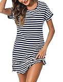 Litherday Nachthemd Damen Kurz Nachtwäsche Streifen Nachtkleid aus 95% Baumwolle Loungewear Negligee Kurze Ärmel Sleepshirt mit 2 Tasche, Dunkelblau+weiß, L