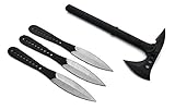 - Das Messer-Set besteht aus 3x Wurfmesser und 1 Tomahawk inklusive Messerscheide und Etui